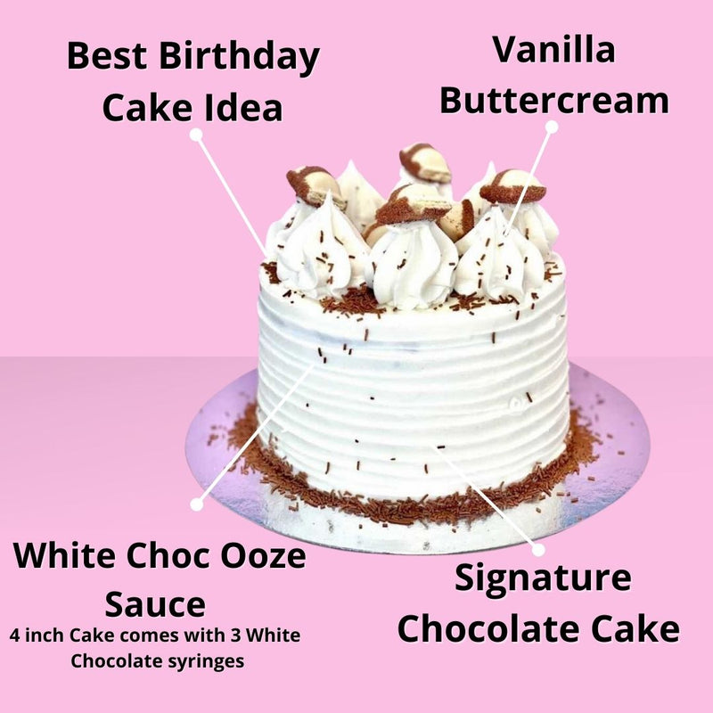 Cake Flavour: Our Signature Chocolate Mud Cake with an Oozing White Chocolate Centre (except 4 inch size*) & Vanilla Buttercream