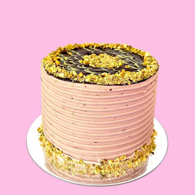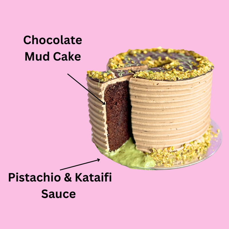 Cake Flavour: Our Signature Chocolate Mud Cake with Pistachio Sauce and Crispy Kataifi Pastry, topped with Chocolate Buttercream. (The pistachio sauce isn’t as oozy as some of our other cakes because of the kataifi pastry, which gives it a slightly thicker texture).