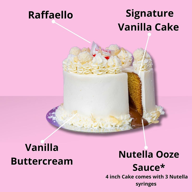 Cake Flavour: Our Signature Vanilla Mud Cake with an Oozing Nutella Centre (except 4 inch size) & Vanilla Buttercream.